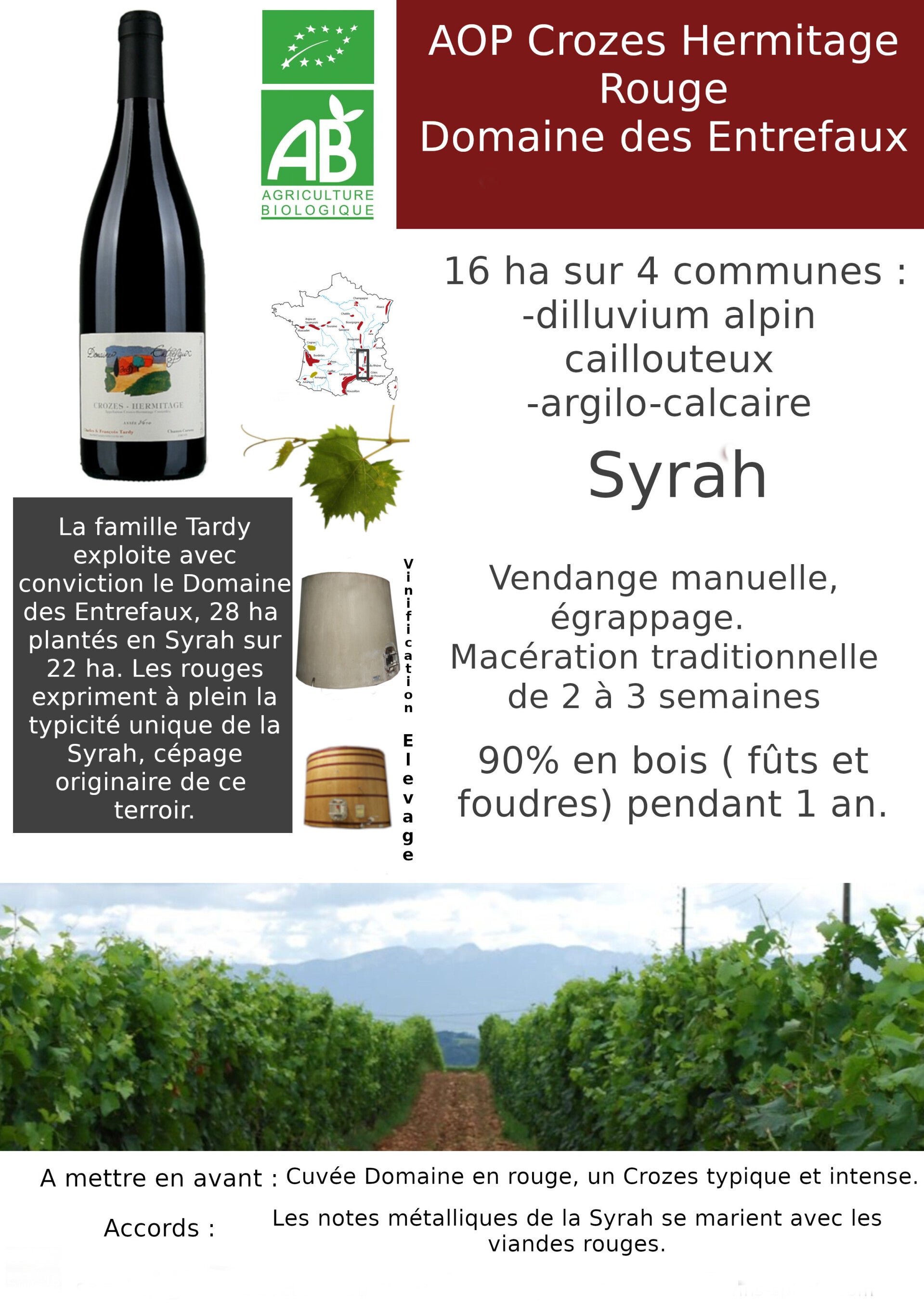 Cépage(s) : Syrah, 16 ha en tout sur 4 communes autour de Mercurol